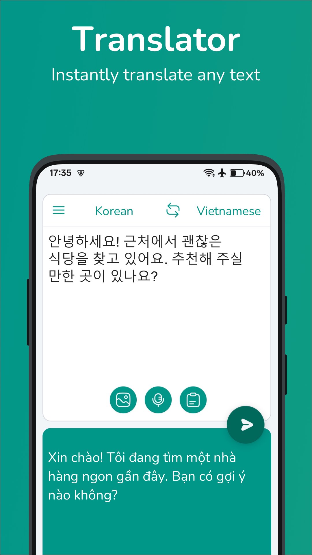 Được hỗ trợ bởi công nghệ AI tiên tiến, dịch chính xác tức thì giữa tiếng Hàn và tiếng Việt. Ứng dụng dịch ngôn ngữ hoàn hảo cho khách du lịch, sinh viên và tất cả những ai đang học hai ngôn ngữ này.