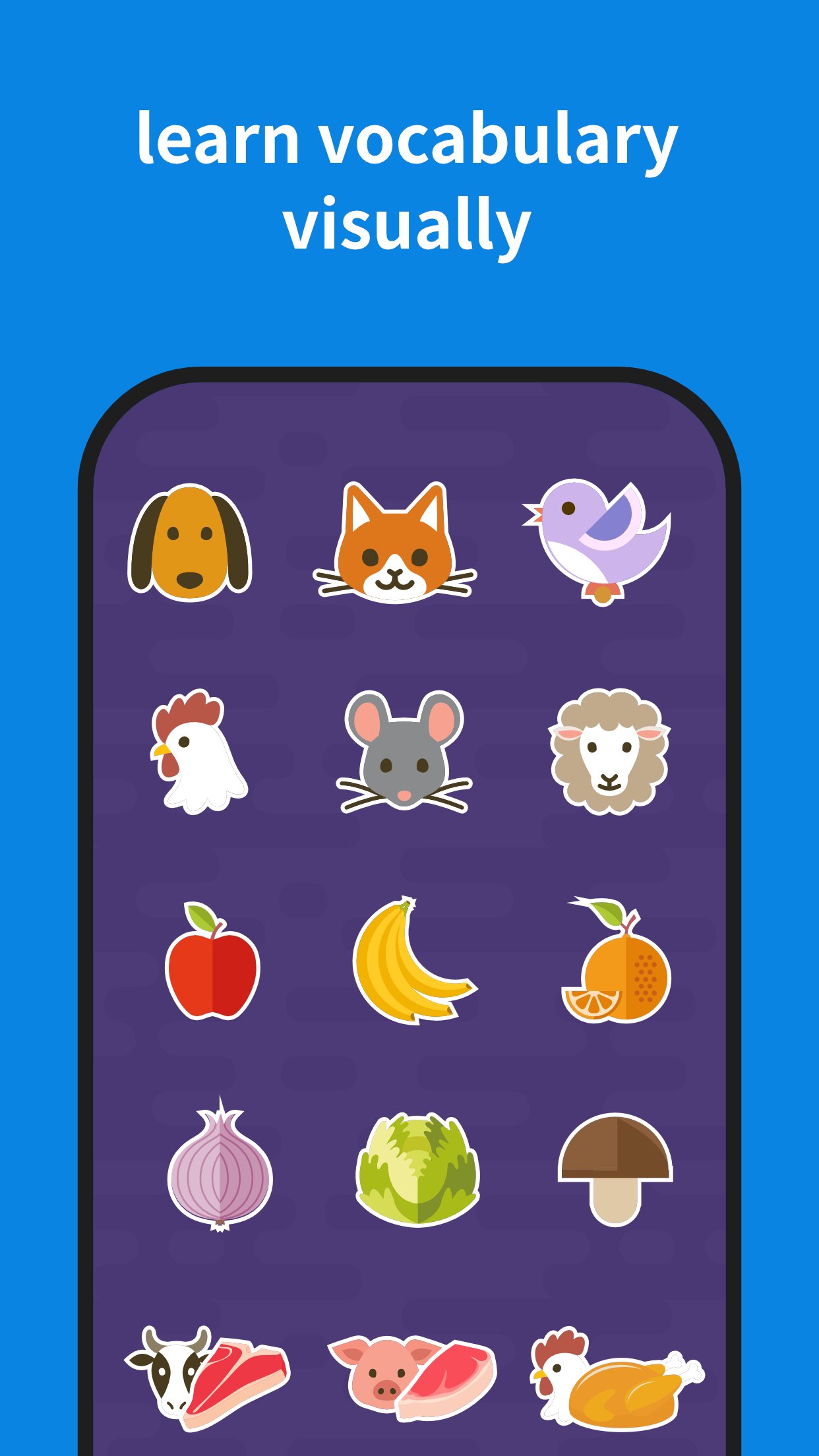 Học từ vựng qua ba hình thức: văn bản, âm thanh và biểu tượng trực quan. Phương pháp đã được chứng minh này giúp tăng khả năng ghi nhớ và thúc đẩy học ngôn ngữ tự nhiên.