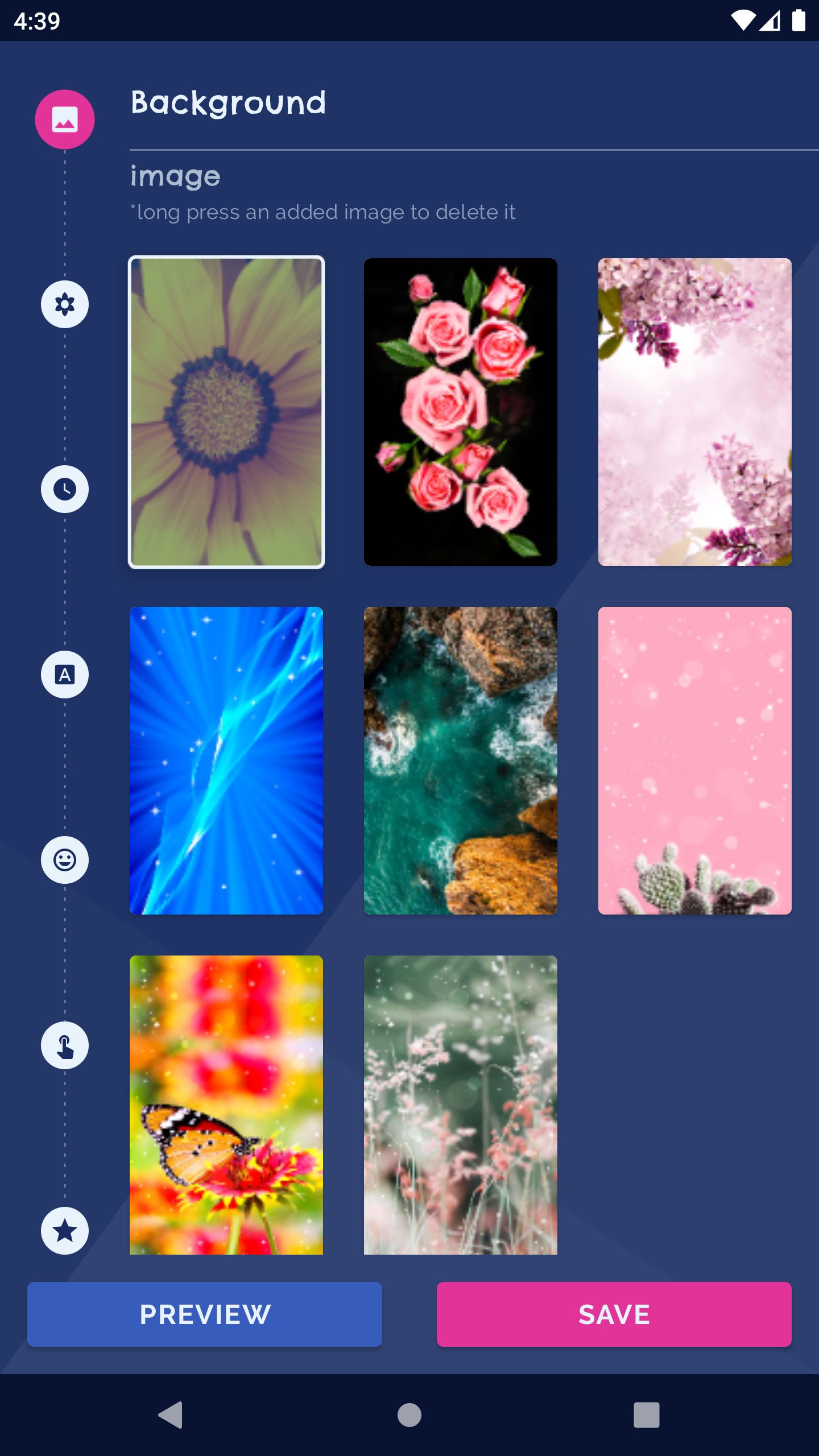Bạn có thể chọn một trong nhiều hình nền HD của chúng tôi hoặc bạn có thể thêm hình ảnh của riêng mình! Bạn có thể thiết lập trình thay đổi nền tự động với cảm ứng kỳ diệu!