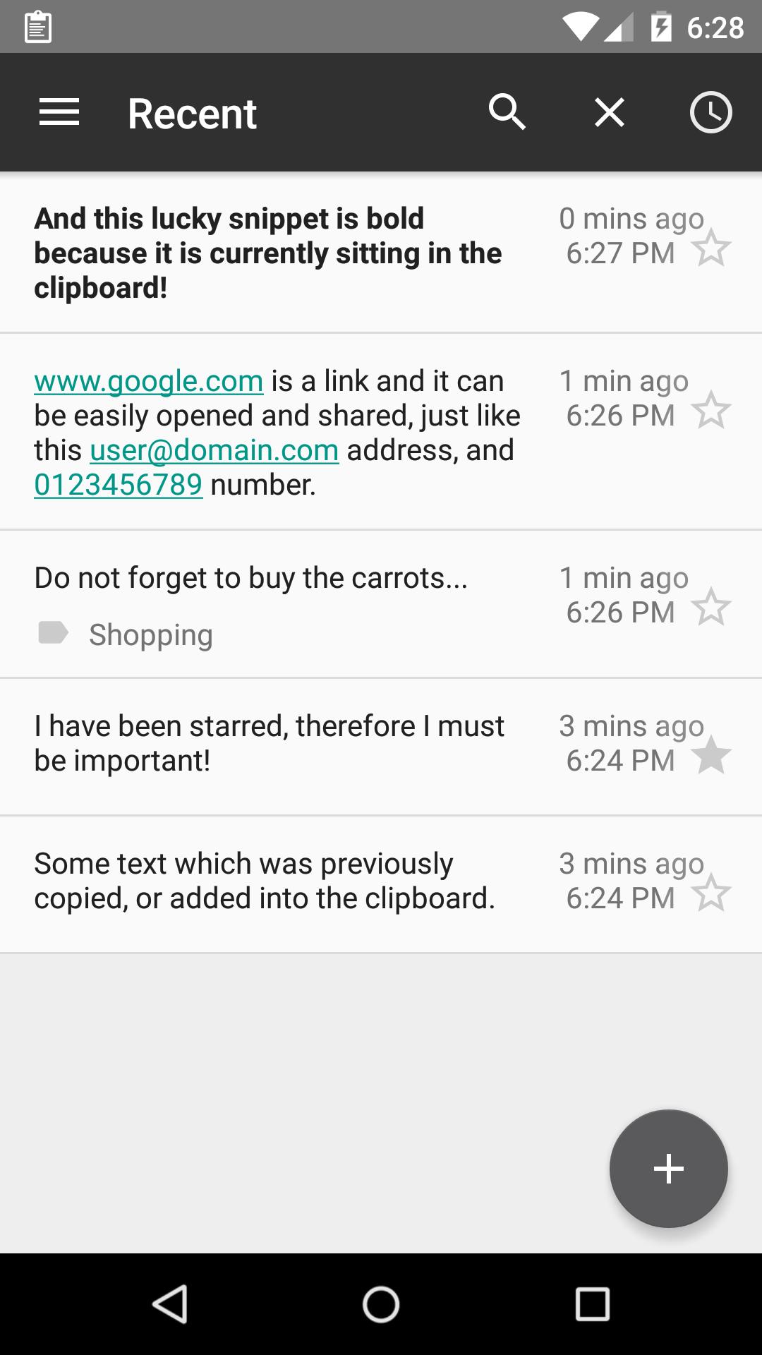 Ngoài ra nó còn tích hợp với Android Quick Search Bar, do đó bạn có thể trực tiếp tìm kiếm lịch sử clipboard của bạn. Nó tiếp tục tích hợp với sao lưu đám mây của Google và phục hồi, vì vậy bất cứ lúc nào bạn xóa thiết bị của nội dung và các thiết lập của bạn sẽ được phục hồi lần sau khi bạn cài đặt ứng dụng (chỉ hoạt động trên Android 2.3 + và sao lưu / khôi phục phải được cho phép trong 'Privacy' cài đặt cho thiết bị của bạn).