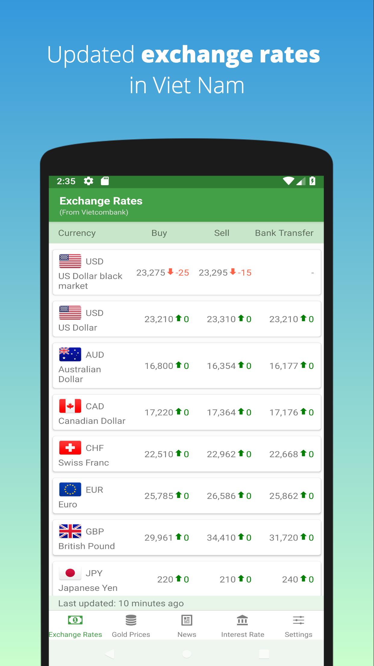 * Theo dõi tỷ giá đồng thời dễ dàng chuyển đồi tiền tệ ngay trong ứng dụng.