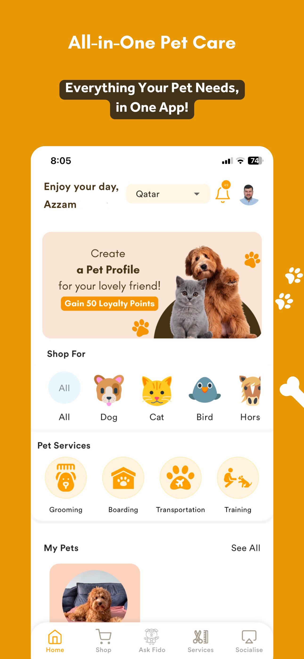- Đặt dịch vụ thú cưng: Lên lịch các cuộc hẹn chải lông, lên máy bay và thăm thú y trong ứng dụng.