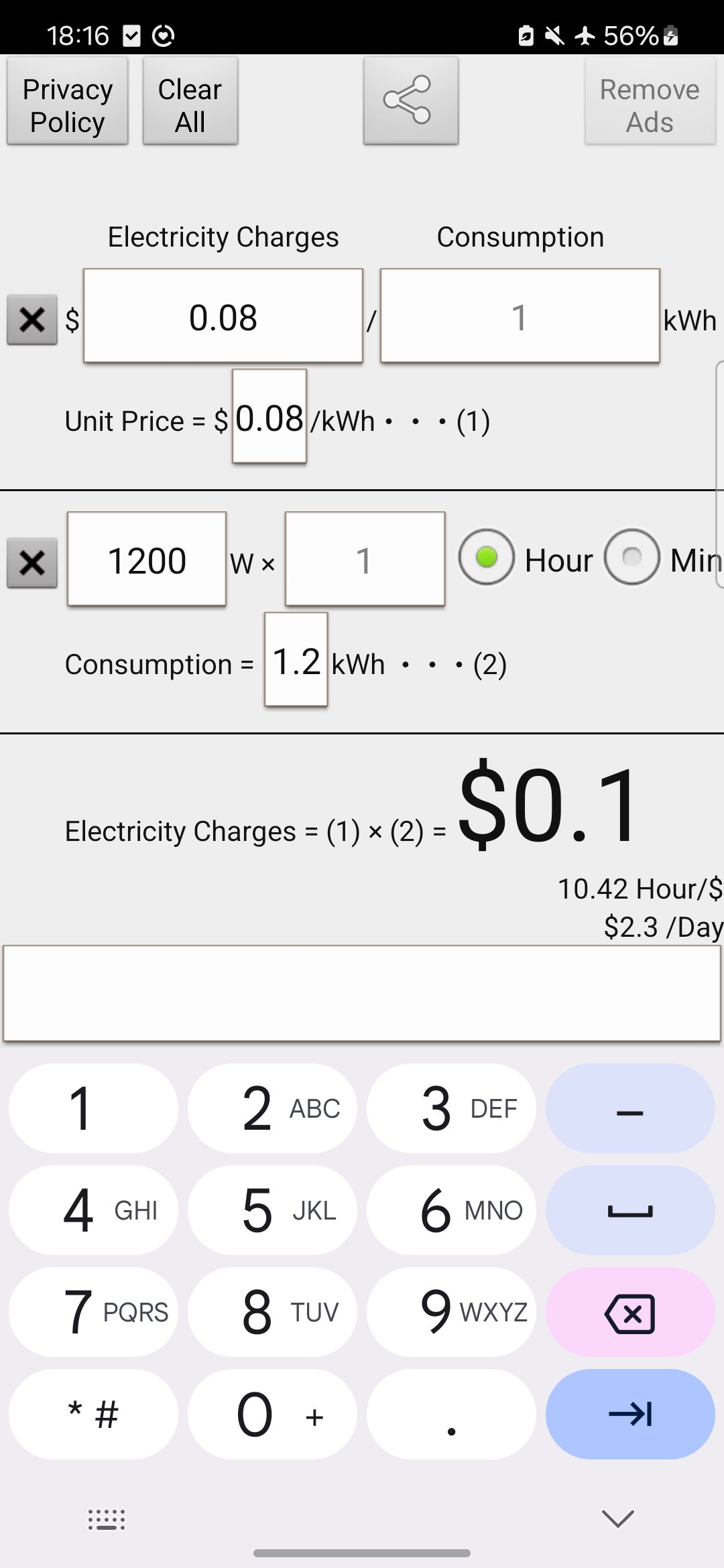 Ứng dụng máy tính tỷ lệ điện miễn phí tính toán giá điện từ đơn giá điện và tiêu thụ điện (kilowatt-giờ). Thời gian trên đơn giá (giây / phút / giờ / ngày / tuần), giá mỗi đơn vị thời gian được tính cùng một lúc.