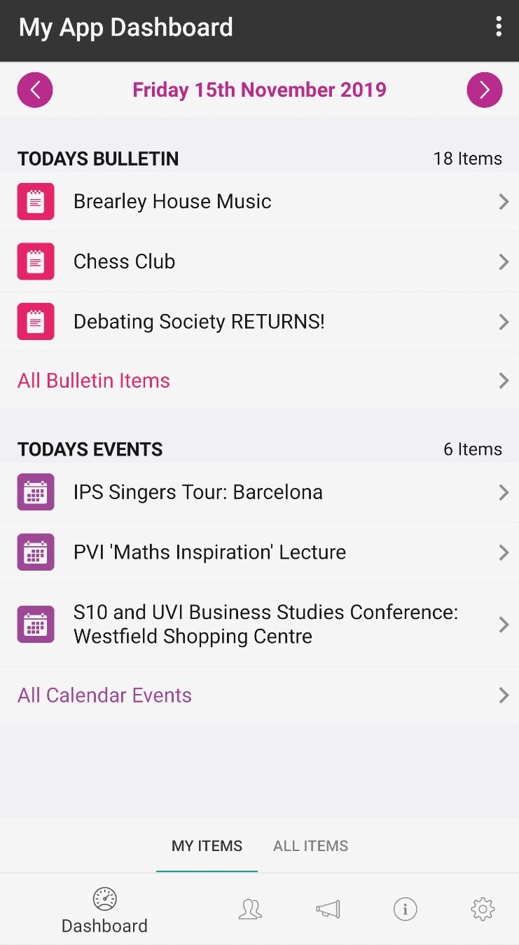 Các ứng dụng iParent trợ phụ huynh một bảng điều khiển hữu ích và cấu hình, nơi họ có thể xem các thông tin và các hoạt động về tất cả các trẻ em tại trường. Liên kết nhanh được cung cấp cho: